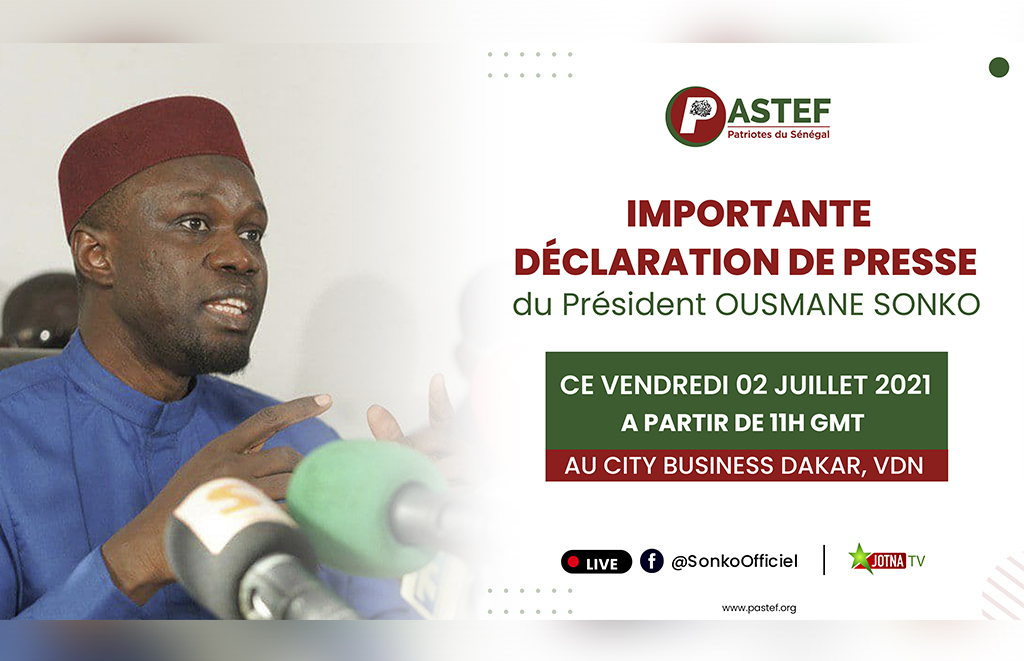 Chers compatriotes, nous vous invitons à suivre la déclaration de presse du Président Ousmane SONKO, ce vendredi 02 juillet 2021 à partir de 11h. A